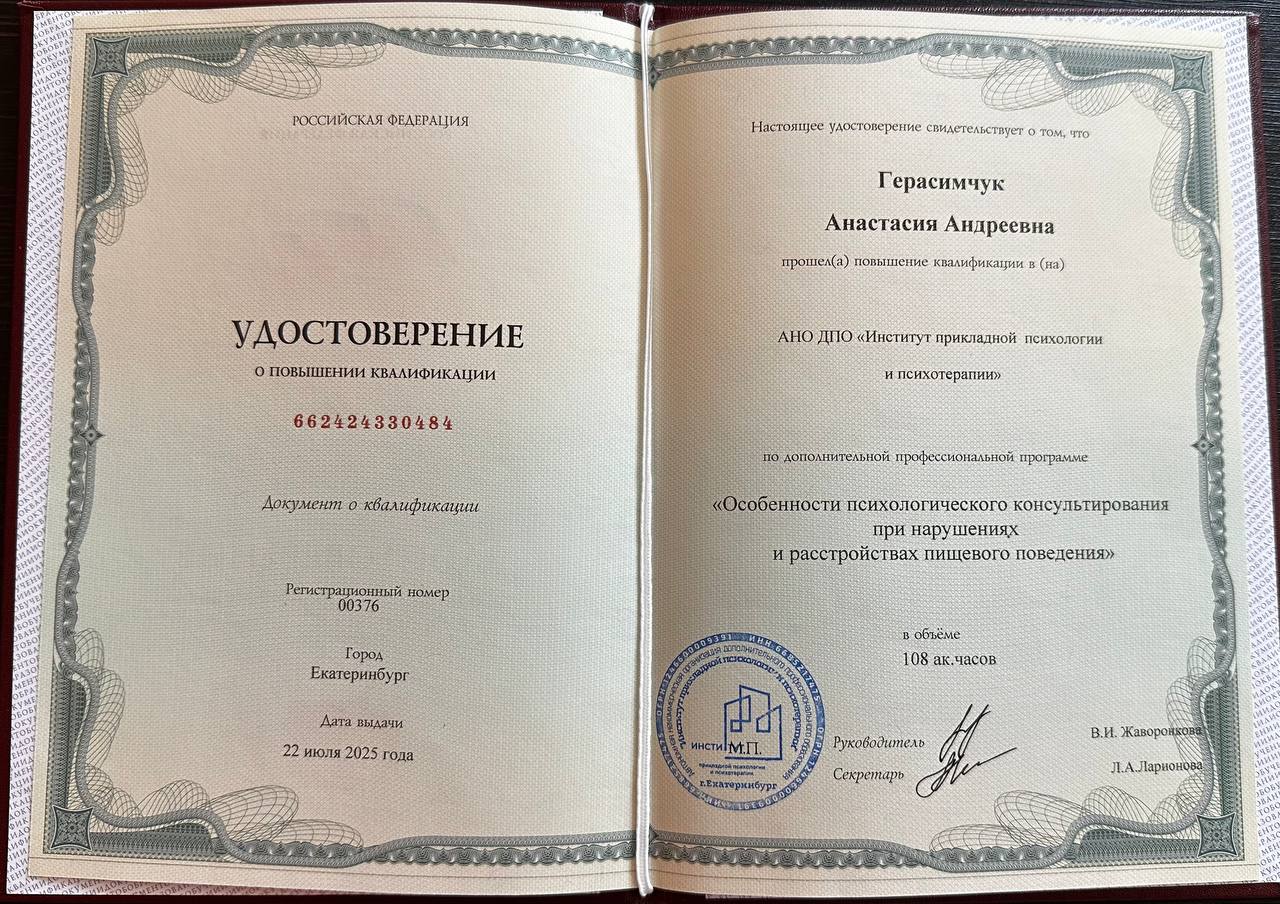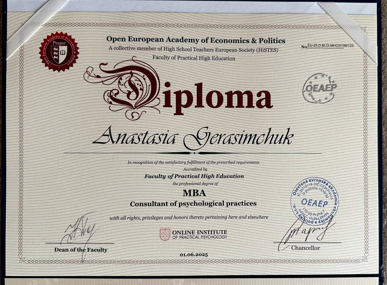 Герасимчук Анастасия- высшее психологическое образование, психолог-консультант, полиграфолог, клинический психолог, куратор в онлайн институте практической психологии, член Общероссийской профессиональной психотерапевтической лиги.